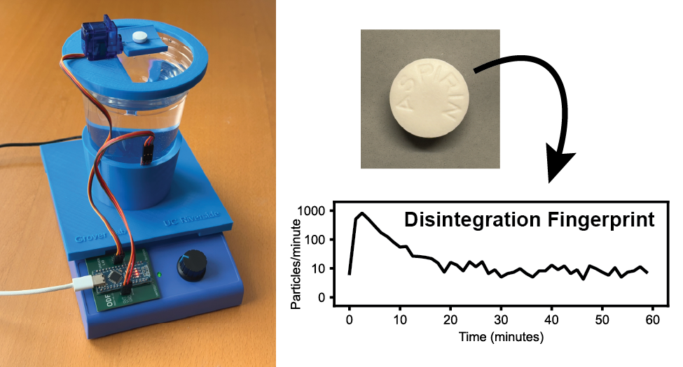 Disintegration fingerprinting uses a water-filled transparent plastic cup atop a conventional magnetic stirrer. An inexpensive sensor mounted on the outside of the cup shines infrared light into the cup and measures the amount of light that is reflected back to the sensor. When a pill is added to the stirred water, the pill begins to disintegrate into particles that swirl around inside the cup. Whenever one of these particles passes near the infrared sensor, the particle reflects additional light back to the sensor and creates a millisecond-duration peak in a plot of sensor output vs. time. The number of particles in the water changes over time as the particles continue to disintegrate and (in some cases) eventually dissolve away. By plotting the number of particles detected vs. time, we create a Disintegration Fingerprint that can be used to identify the drug product. In a proof-of-concept study, we used DF to analyze 96 pills from 32 different drug products (including antibiotics, opioid and non-opioid analgesics, antidepressants, anti-inflammatories, antiemetics, antihistamines, decongestants, muscle relaxants, expectorants, sleep aids, cold medicines, antacids, hormonal birth control, and dietary supplements, as well as a simulated falsified drug product). We found that DF correctly identified 90% of these pills, and the technique can even distinguish name-brand and generic versions of the same drug. By providing a fast (60-minute), inexpensive ($33 USD), and easy-to-use tool for identifying substandard and falsified medicines, Disintegration Fingerprinting can play an important role in the fight against fake drugs.
